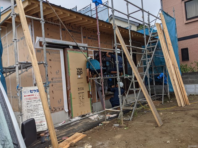 藍色の服の2名の方が連窓を取り付け中。