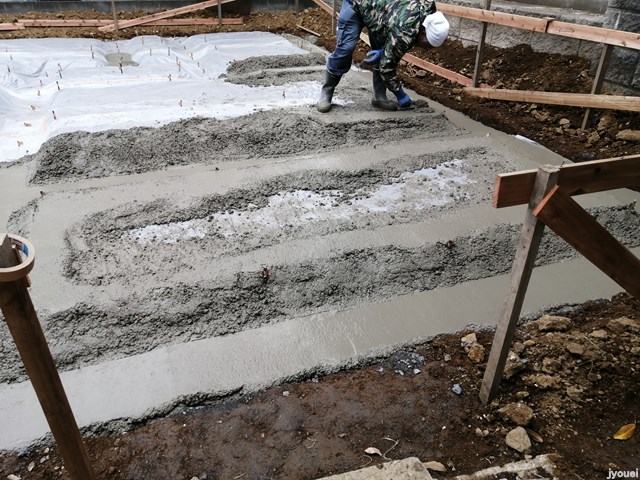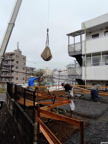作業しやすい場所に砂利を届ける繊細作業をしています。