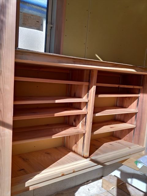 天板がヒノキ・棚板が杉の下駄箱や