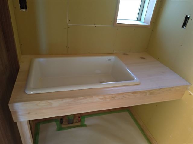 ヒノキの無垢材が天板の洗面台