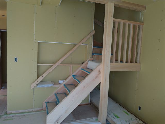 ヒノキ手摺の無垢板階段に