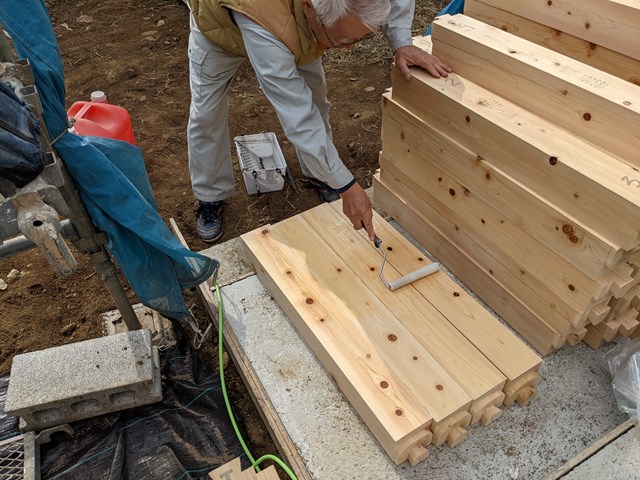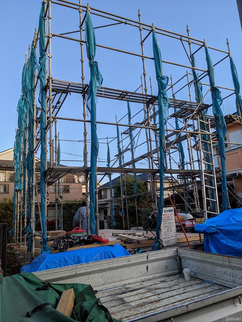現場では足場も設置され、プレカットされた材も運びこまれ