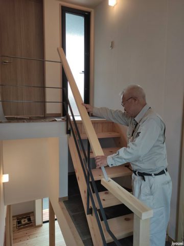 厚木 H邸新築注文住宅17 まもなく引き渡しBy 民家工房常栄 / 2020年11月15日 H様宅のお掃除に向かうと 現場監督ニコ君がお出迎え 「遅ーい。僕は毎日朝から監督してるぞ」 「罰としてナデナデしてから仕事だぞ」 と、ニコ君が思っていたかは別として 朝からモフモフ出来て幸せな♪。 さぁお仕事お仕事。 ロフトでは山本大工が追加の床貼りを 中腰姿勢をものともせず完成させ 作業場で作った手摺を 取り付け 完成させ そして最後のお仕事、階段手摺の取付を 完了 ~「空気・水・素材」をイエカラ整える~本物の国産自然素材と遮断熱住宅は民家工房常栄~