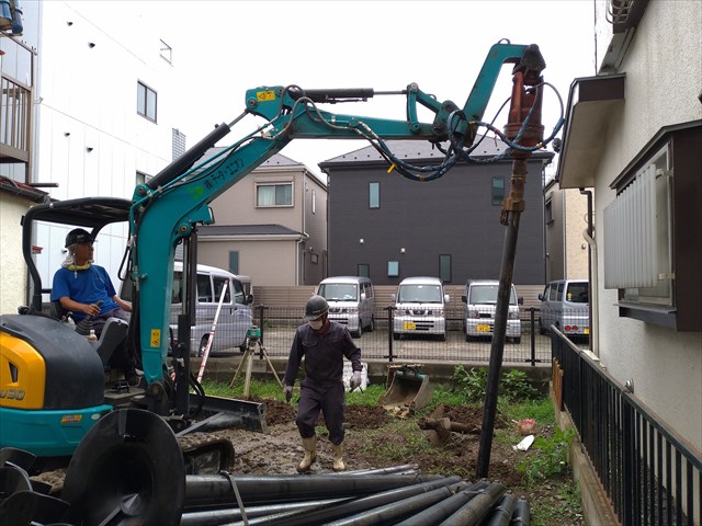 番外編 南区 新築住宅2 地盤改良By 民家工房常栄 / 2020年1月20日 検査により地盤改良が必要と判断され ハットウィング工法で27本の杭埋め込み工事が行われます。 入口の難所も合図をしながら入り クレーンも巧みに操り作業が進みます。 杭を溶接作業でつなげて クレーン先端金具を変更し 地盤に突き刺し 打ち込みます。 この作業をあと26か所進めます。