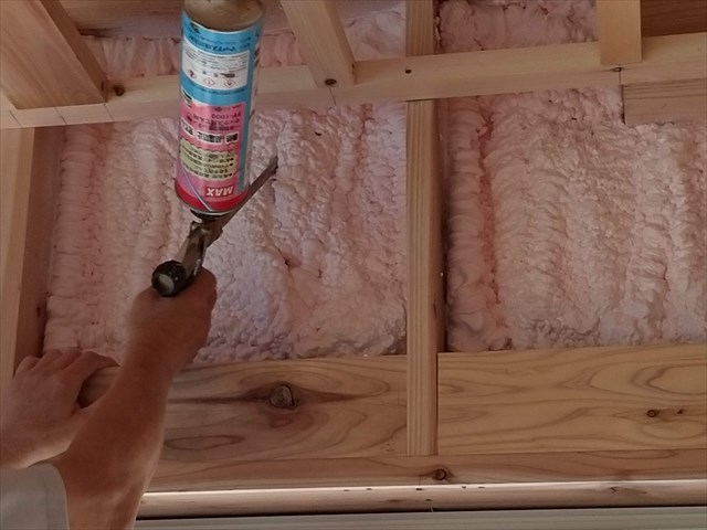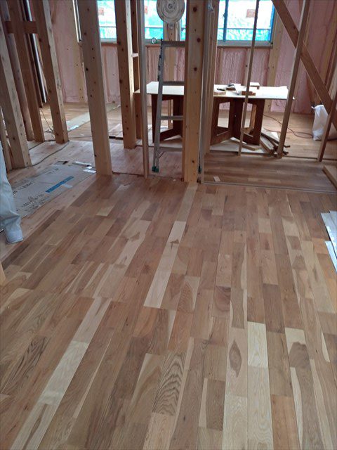 相模原 N邸新築注文住宅7 カバ桜と楢By 民家工房常栄 / 2019年11月15日 床板張りの進む現場 N様宅は常栄おすすめの杉の浮造りよりも 広葉樹を好まれ 無垢材のカバ桜になりました。 杉の浮造りと違いぬくもりはありませんが 固いので傷がつきにくい素材です。 2階の廊下もおなじくカバ桜 そして2Fのお部屋は無垢材の楢です。 山本は先日施工箇所の手直し中 隙間のある箇所を少し大きめに切り取り 届いた物でしっかり穴埋め ~「空気・水・素材」をイエカラ整える~本物の国産自然素材と遮断熱住宅は民家工房常栄~