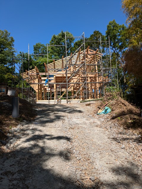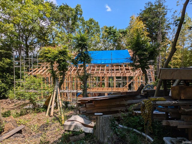 足柄9By 民家工房常栄 / 2024年7月1日 スケルトンだった屋根には 荒野地が貼られ ブルーシートがかかっています その先の鼻先の部分の 化粧垂木の上に 先日運んだ 広小舞を貼り→ 化粧野地を貼り→ その上に垂木を施すと 二重垂木の完成になります。 人がするお化粧と順番が違い 化粧は下側。 下から眺める側になります。 ~日本の固有種と手仕事の家づくりを守り使い伝える民家工房常栄~