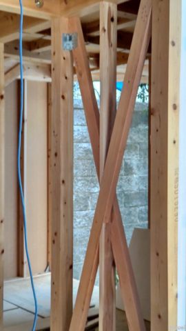 筋交い金物とホールダウン金物(地震の際に柱が抜けないため)