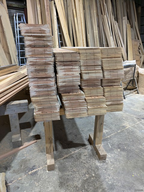 スケルトンだった屋根には 荒野地が貼られ ブルーシートがかかっています その先の鼻先の部分の 化粧垂木の上に 先日運んだ 広小舞を貼り→ 化粧野地を貼り→ その上に垂木を施すと 二重垂木の完成になります。 人がするお化粧