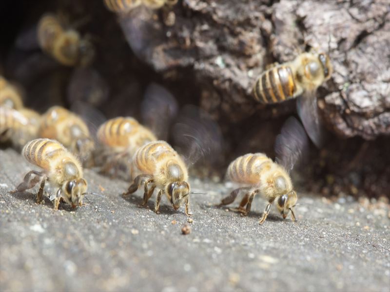 ミツバチ エアコン(扇風器)かな? 熱くなると 門番さんが 天然エアコンに 大活躍 室内の幼虫(子供たちに) 風を送り続けます。 それでも 真夏になると 蜜ろうが溶けて 巣落ちしてしまいます。 もしも、巣落